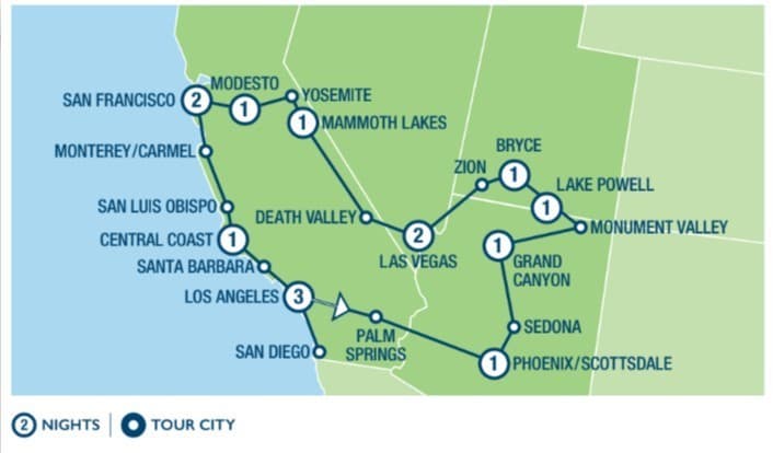 Journey south through the Santa Ynez valley into Santa Barbara where palm–lined walkways border white sandy beaches. Upon arrival in Los Angeles an orientation tour commences to include Hollywood, portions of Beverly Hills and Century City before arriving in Santa Monica, home to the finish line of Historic Route 66, where you may enjoy an optional lunch on the pier before arriving at your hotel.